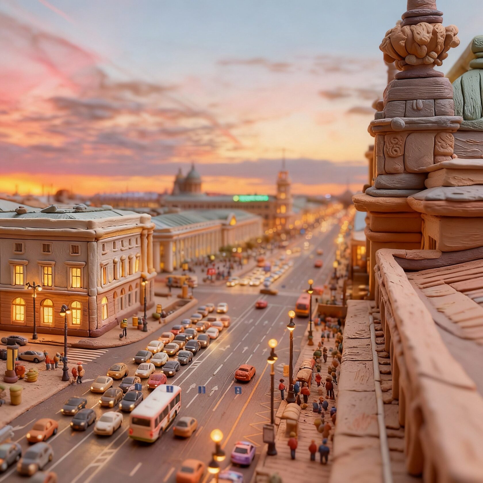 Воссоздай всю сцену в виде гиперреалистичной диорамы из вылепленной вручную полимерной глины: каждый элемент тщательно вылеплен с детальной проработкой, видимые следы инструментов и текстурирования, мягкие переходы цветов. Гладкая или текстурированная поверхность с естественными неровностями ручной лепки, матовый или слегка атласный финиш. НИКАКИХ реальных материалов — только полимерная глина с характерной пластичной эстетикой. Богатая палитра смешанных оттенков глины, видимые отпечатки пальцев и стеков, рельефные детали и тиснение, фантазийные или реалистичные формы. Мягкое рассеянное освещение, подчёркивающее объём и текстуру, макрофотография с глубиной резкости, уютная рукодельная атмосфера миниатюрного мира, разрешение 4K, детализация текстуры глины и следов лепки.