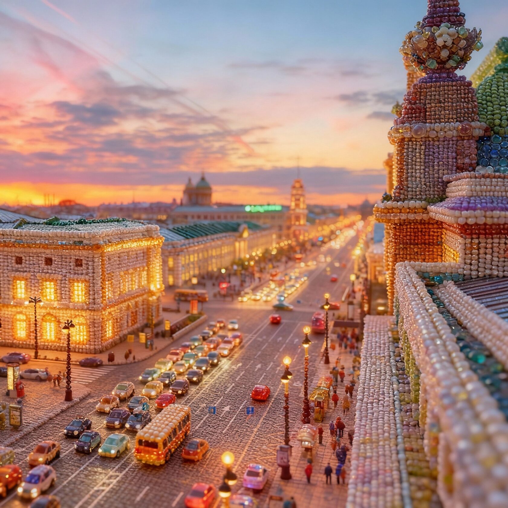 Сделай фото полностью из блестящего бисера и стекляруса - обстановка вся из бисера и блестящих бисерных сочетаний, все элементы картинки сплетены из бисерного полотна и стекляруса, оттенки картинки - теплые, киношные, бисерные передний и задний план, каждая деталь фотографии, все из бисера, и элементы из блестящего стекляруса, сделай обстановку немного игрушечной.