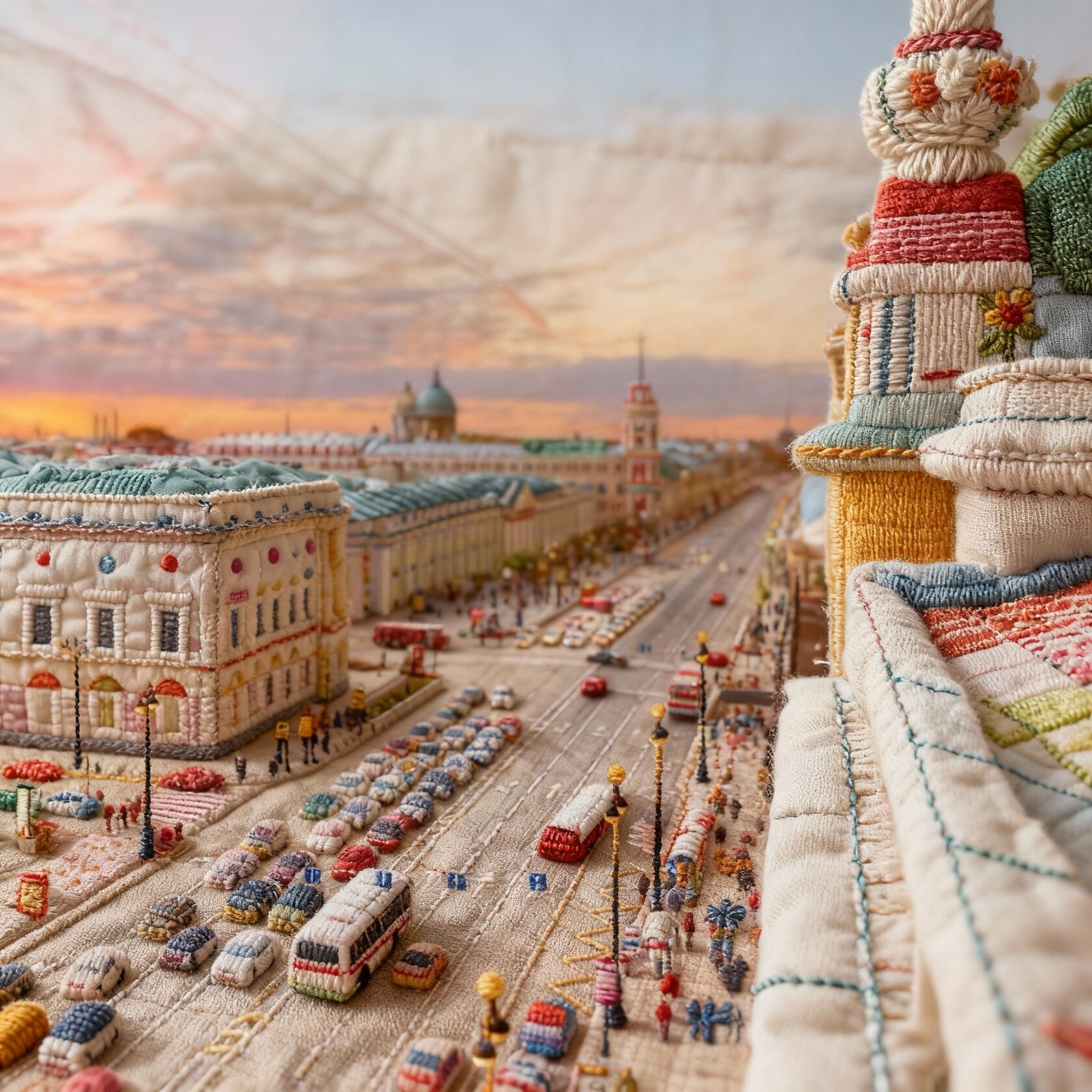 Преобразуй мою фотографию в пэчворк-мир. Воссоздай всю сцену в виде гиперреалистичной диорамы из лоскутного шитья: всё сделано из настоящих кусочков ткани, разноцветных лоскутков, вышитых стежков и текстильных аппликаций. Яркие хлопковые принты, видимые швы и стёжки, мягкая фактура ткани с небольшими складками и объёмом. НИКАКИХ реальных материалов или текстур — только текстиль, нитки, пуговицы и декоративные швы. Разнообразные узоры лоскутков: горошек, полоска, цветочные принты, однотонные элементы. Мягкое рассеянное освещение, подчёркивающее фактуру ткани, глубина резкости, уютная рукодельна...