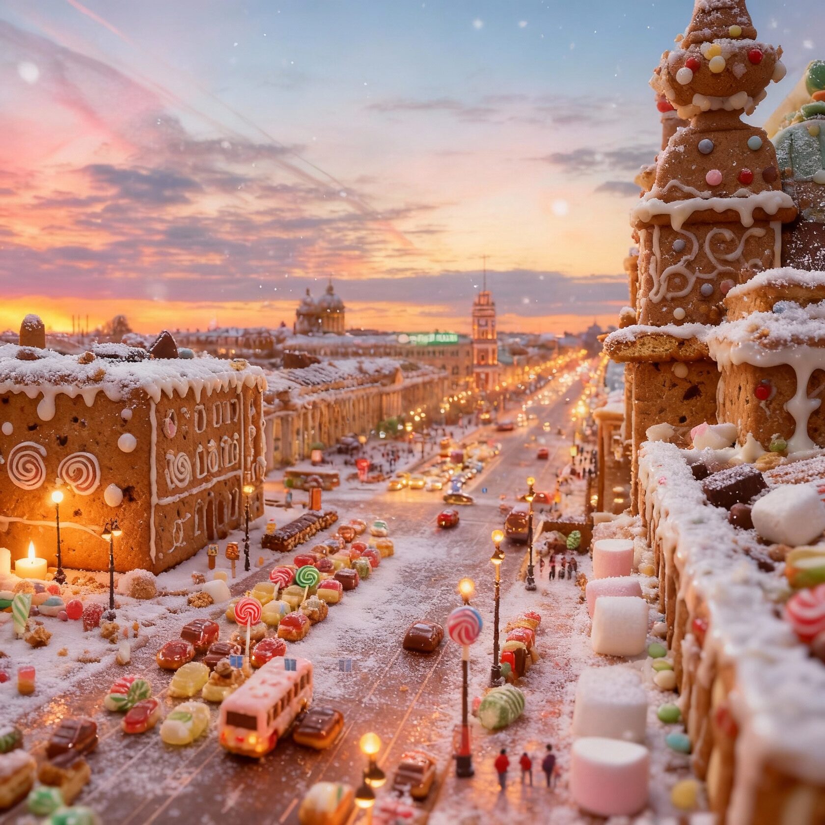 Воссоздай всю сцену в виде гиперреалистичной диорамы из пряников и сладостей: всё сделано из настоящих пряничных печений, сахарной глазури, леденцов, мармелада, мятных конфет, кусочков шоколада и разноцветных конфетных украшений. Тёплые коричневые тона пряников с белой глазурью, видимая текстура печенья и крошки, глянцевые поверхности конфет с бликами. НИКАКИХ реальных материалов или текстур — только съедобные сладости, выпечка и кондитерские изделия. Замысловатые детали из глазури с точками, завитками и узорами. Мягкое рассеянное освещение с тёплым свечением, глубина резкости, эффект «снега» из сахарной пудры, уютная праздничная атмосфера, разрешение 4K, макродетализация с текстурой печенья и глазури.