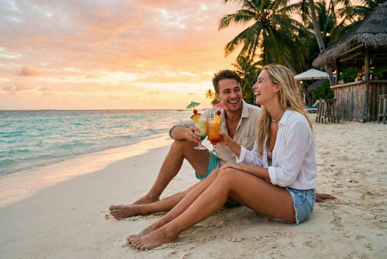 Промпт: Парень с девушкой пьют коктейли, плещутся волны.