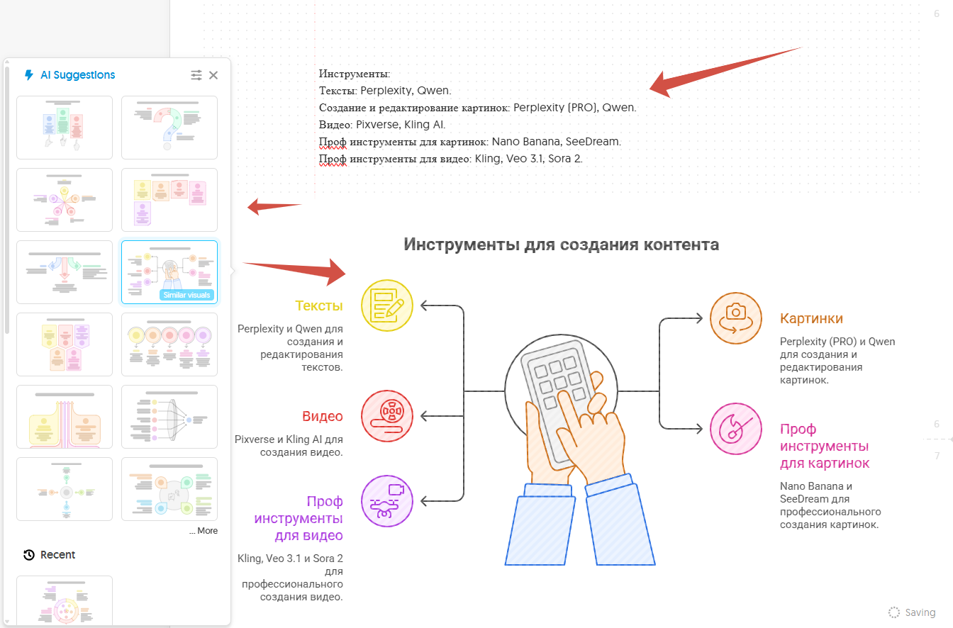 Например я хочу оформить список нейросетей для разных задач. Пишу его в Napkin, навожу курсор и слева появляется синий значок молнии. Нажимаю его - через минуту у меня ДЕСЯТКИ вариантов визуализации. Выбираю нужный и могу менять цвет, текст, толщину линий и т.п.