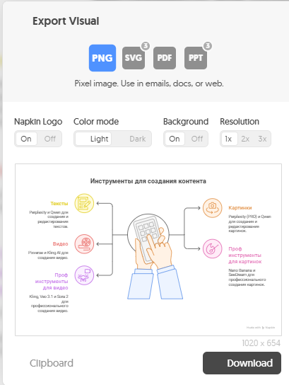 Вместо того чтобы описывать результаты кампании или аналитику длинным текстом, вы можете загрузить ключевые выводы в Napkin AI — и получить готовую инфографику для соцсетей, блога или презентации. Это особенно ценно для соцсетей, где визуалы получают в разы больше вовлечения.