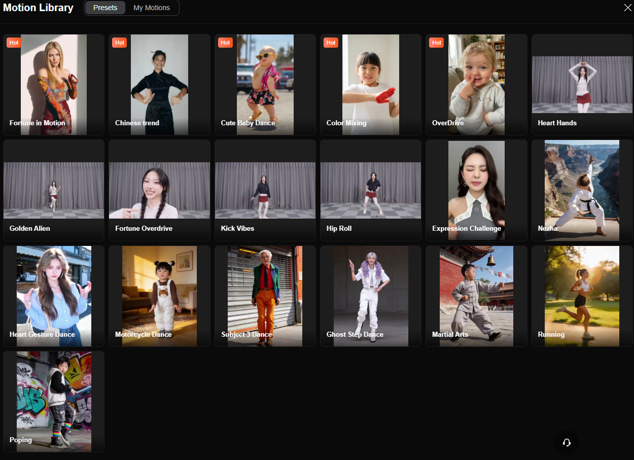 Кроме того, так же можно выбрать режим Motion Control. Помимо замены в своем видео, будут доступны и пресеты.