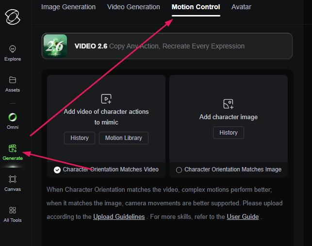 Слева в меню выбираете Generate, далее вверху Motion Control. теперь нам надо загрузить видео, с которого берем движение.